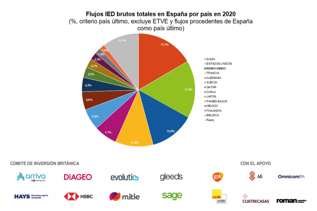 El estudio brinda el dato de inversión británica en España en 2020, en un año en que la pandemia redujo la inversión directa extranjera (IED) procedente de todo el mundo y con destino en nuestro país. En concreto, y excluyendo a las entidades de tenencia de valores extranjeros (ETVE), el año pasado Reino Unido invirtió 2.660 millones de euros en España: un dato ligeramente por debajo del promedio de años ordinarios, pero que representó el 13,6% del toda la IED destinada a España. Ese dato convirtió a Reino Unido en el tercer mayor inversor en España: un peldaño por debajo respecto a la clasificación de 2019 y solo por detrás de Estados Unidos y de Suiza, que mejoró su posición inversora de forma coyuntural al hilo de la adquisición de BME por parte de SIX Group.