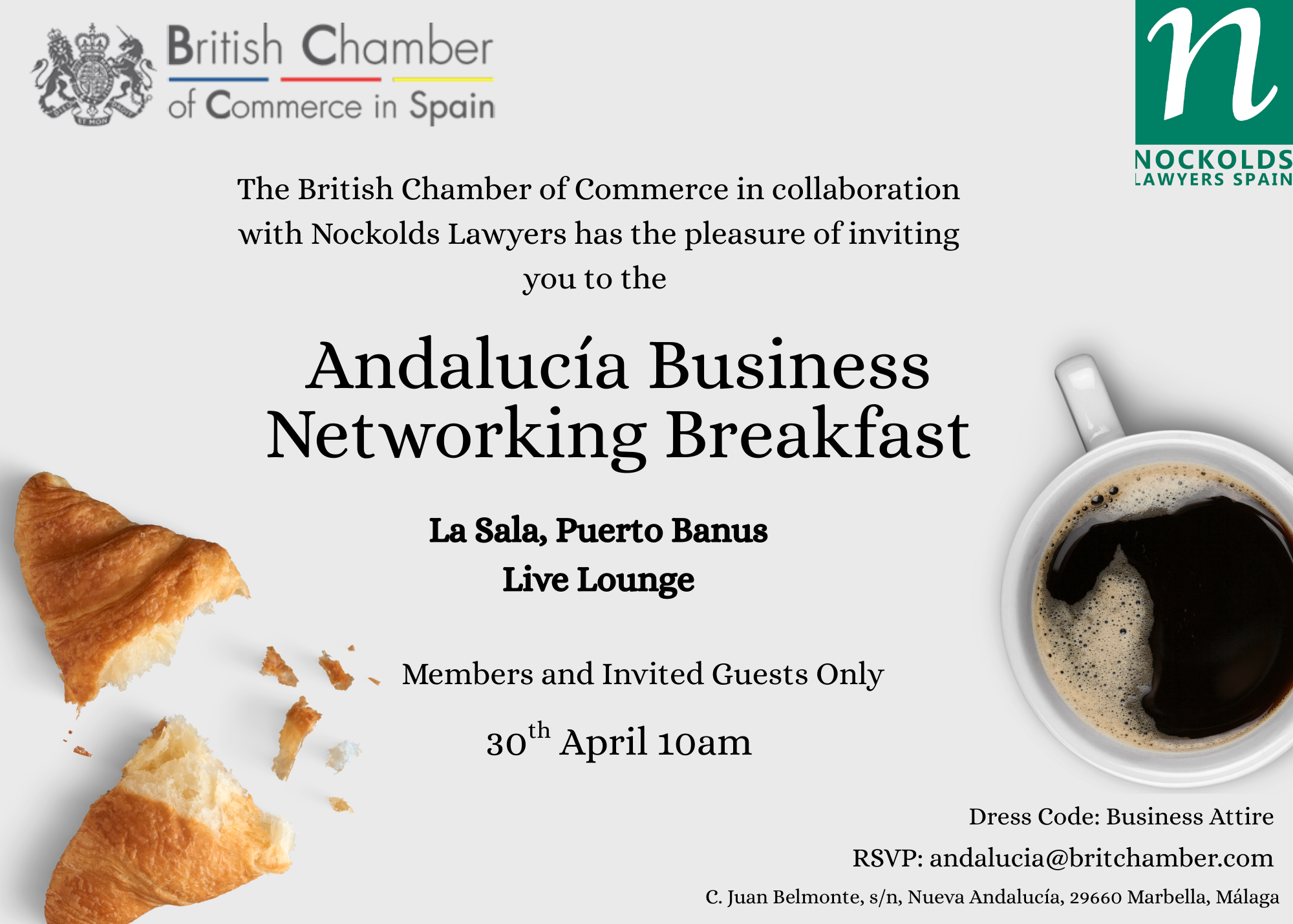 The British Chamber of Commerce in Spain has the pleasure of inviting you to our upcoming Andalucía Business Networking Breakfast, in collaboration with Nockolds Lawyers Spain, at the stunning venue of La Sala in Puerto Banús.