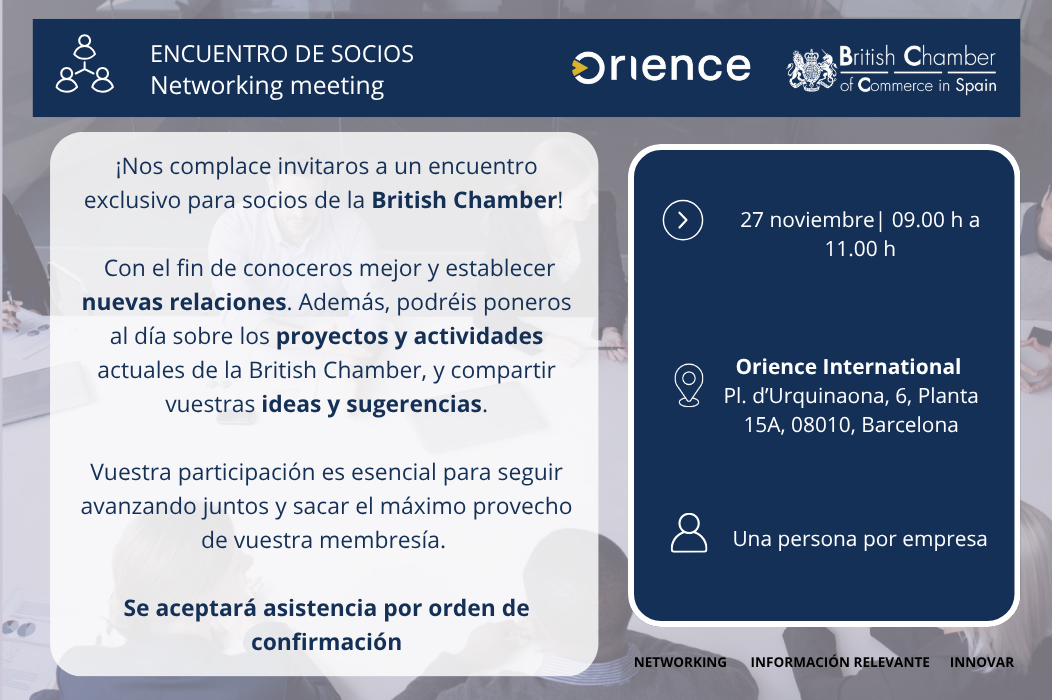 Nos complace invitaros a un encuentro para socios de la British Chamber, donde podréis conoceros y hacer relaciones. También será una buena oportunidad para escucharos y poneros al día de los proyectos y actividades de la British Chamber. Vuestra participación es fundamental para avanzar juntos y que optimicéis vuestra membresía ¡Os esperamos!