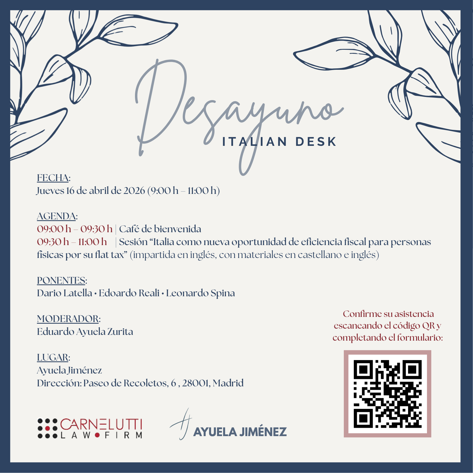 Nos complace invitarle al Desayuno – Italian Desk, una iniciativa conjunta de Ayuela Jiménez (España) y Carnelutti | Law Firm (Italia), que se celebrará en Madrid, conforme a los siguientes detalles: