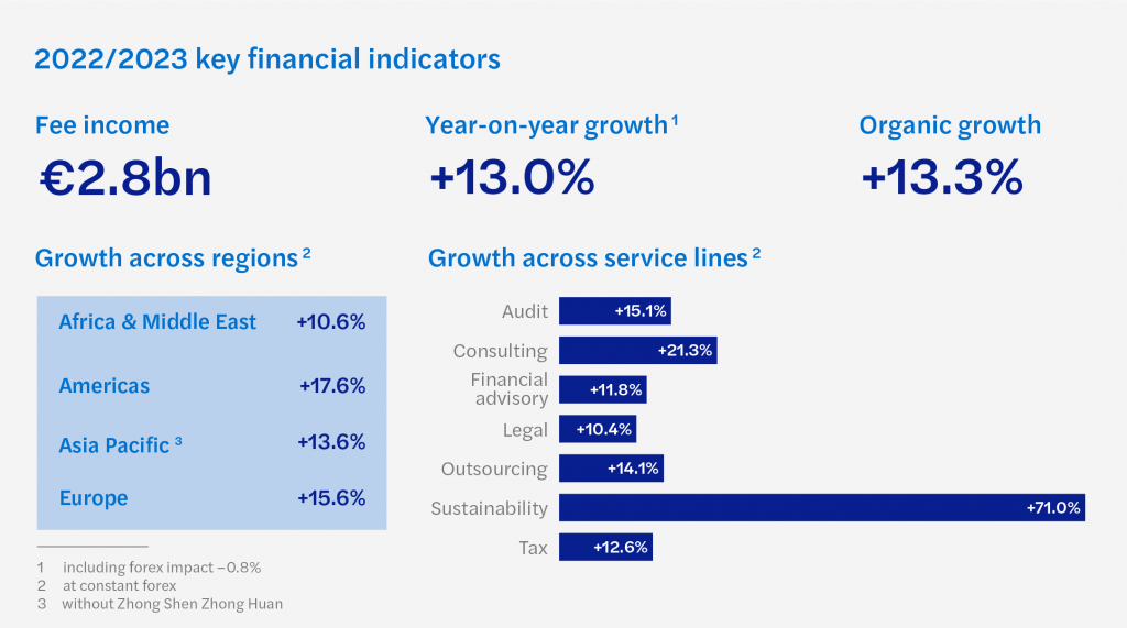 6 de febrero de 2024 – Mazars, firma internacional de auditoría, asesoramiento fiscal y legal y consultoría, ha publicado hoy sus resultados financieros globales del ejercicio 2022/2023. A pesar de la situación de incertidumbre del mercado, la facturación ha aumentado un 13% respecto al ejercicio pasado, alcanzando los 2.800 millones de euros. De esta forma, la Firma ha logrado, por tercer año consecutivo, un crecimiento de dos dígitos en todas sus líneas de servicio (tanto en auditoría como en el resto de servicios).