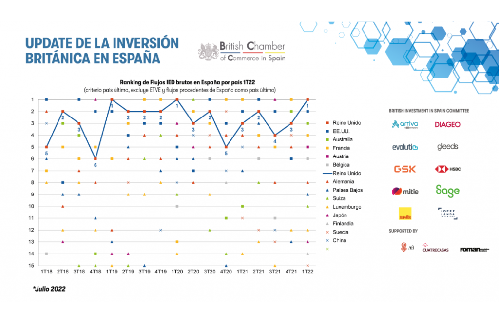 Para Aida García, presidenta de la Cámara de Comercio Británica en España y directora para España y Portugal de Cambridge University Press & Asessment: “estos datos remarcan una clara preferencia de Reino Unido por España, como país objeto de sus inversiones. Con respecto a esto, a lo largo de los años, hemos visto una evolución exponencial que se consolida en este primer trimestre de 2022. Confiamos en que, a pesar del contexto actual, esta tendencia siga en crecimiento ascendente y consolide este primer puesto a nivel mundial”.